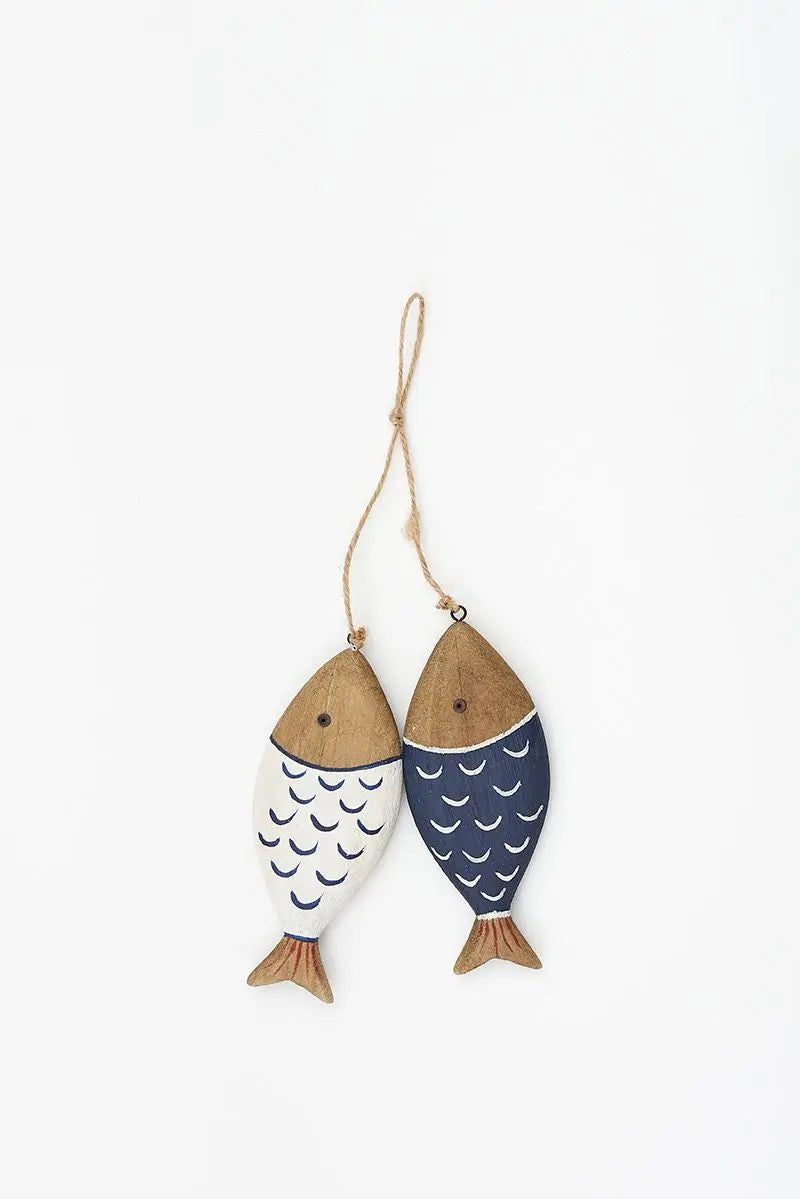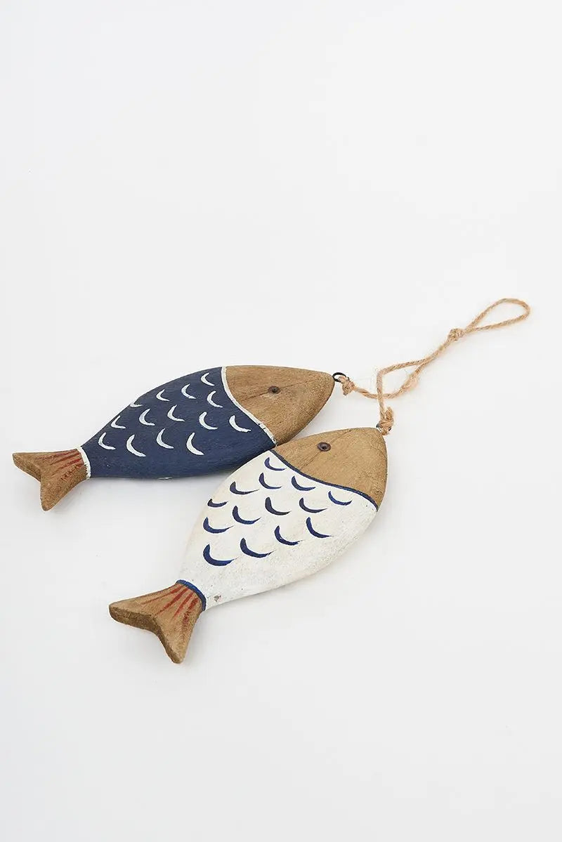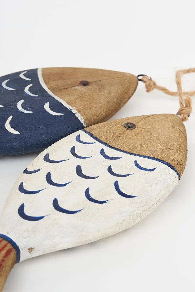 Ristra de 2 peces de madera, con las escamas pintadas. Una blanca y otra azul con aspecto envejecido. Dimensiones: h: 20 cm.