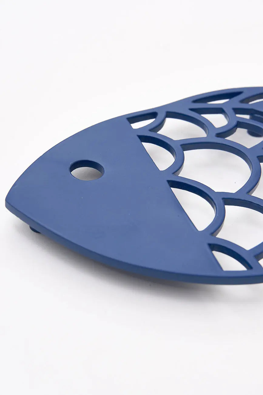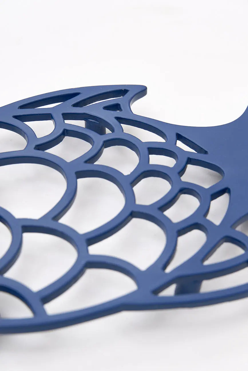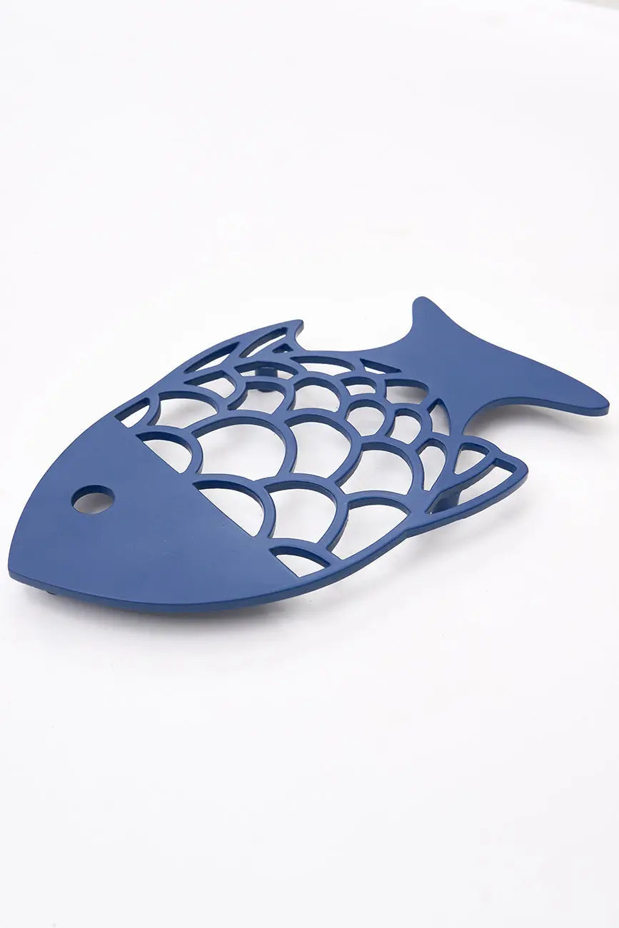 Salvamantel de aluminio con forma de pez. Este salvamantel de aluminio, con su forma estilizada de pez, es una combinación perfecta de funcionalidad y diseño marino. Su estructura resistente protege tus superficies del calor, mientras su acabado pulido añade un toque brillante y elegante. Ideal para quienes buscan detalles decorativos que evocan la frescura del océano. Dimensiones: l: 22,5 cm – w: 14 cm – h: 2 cm.