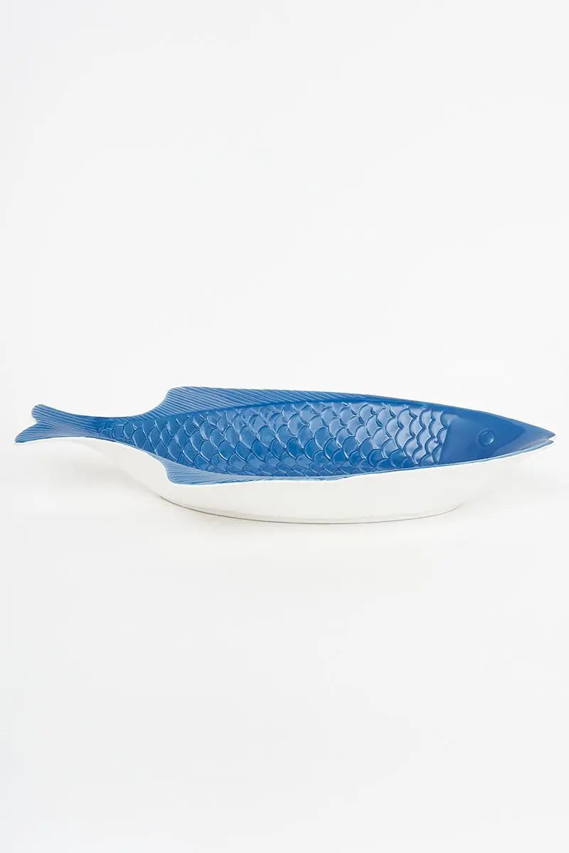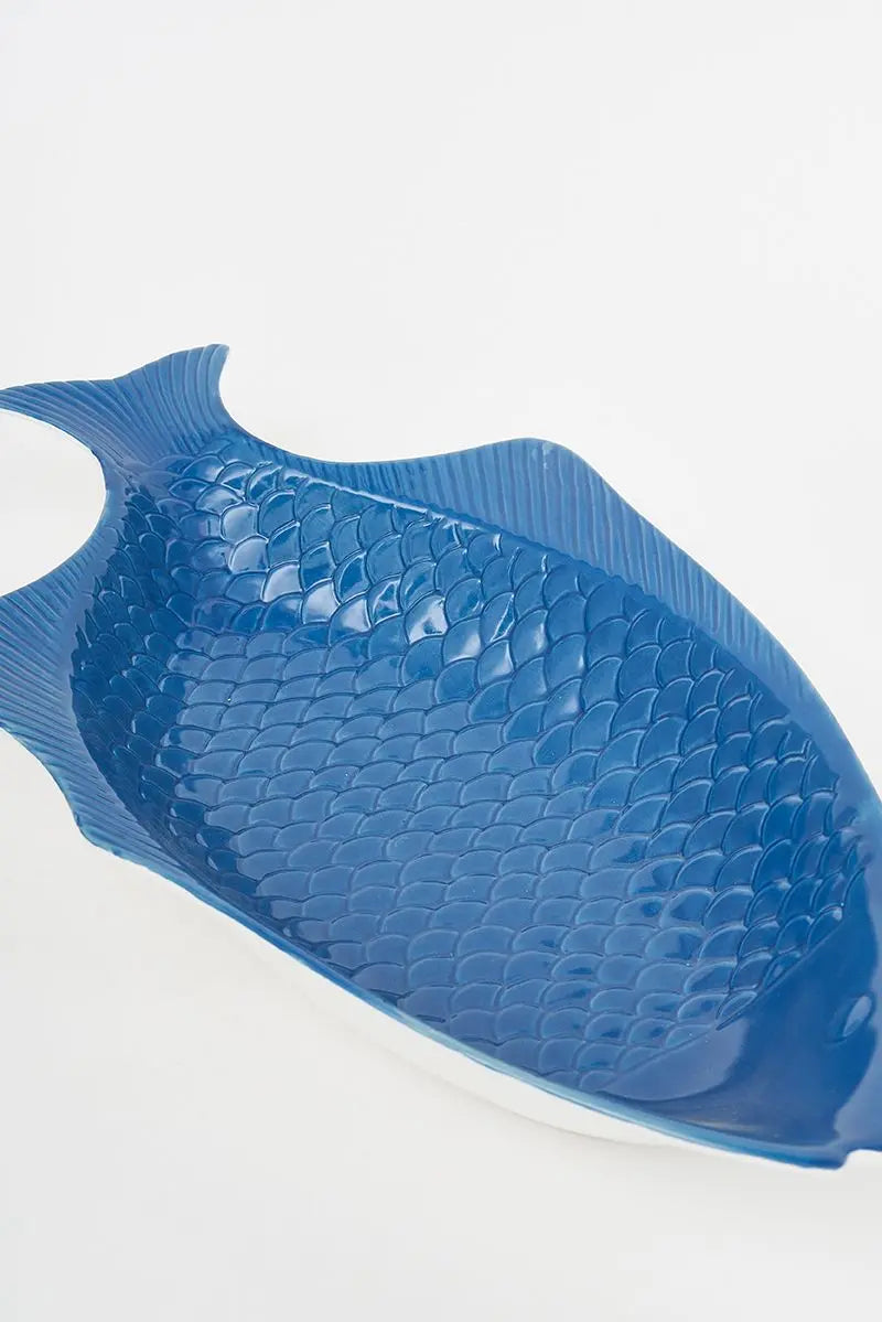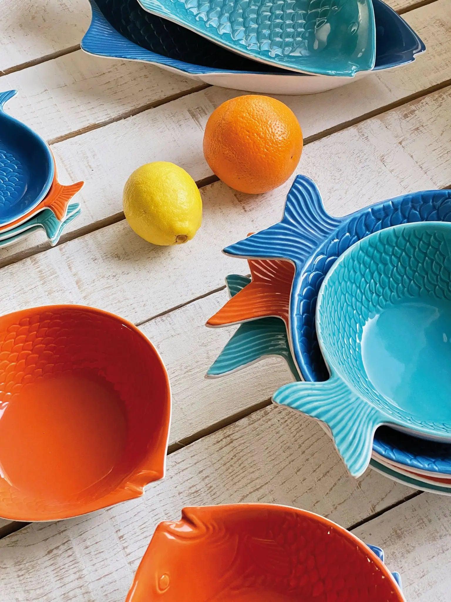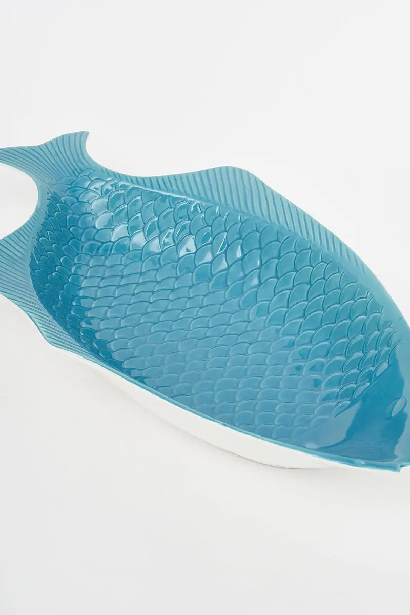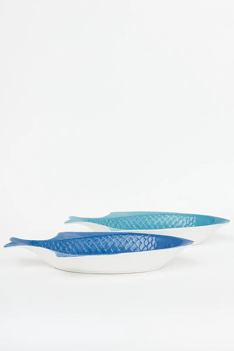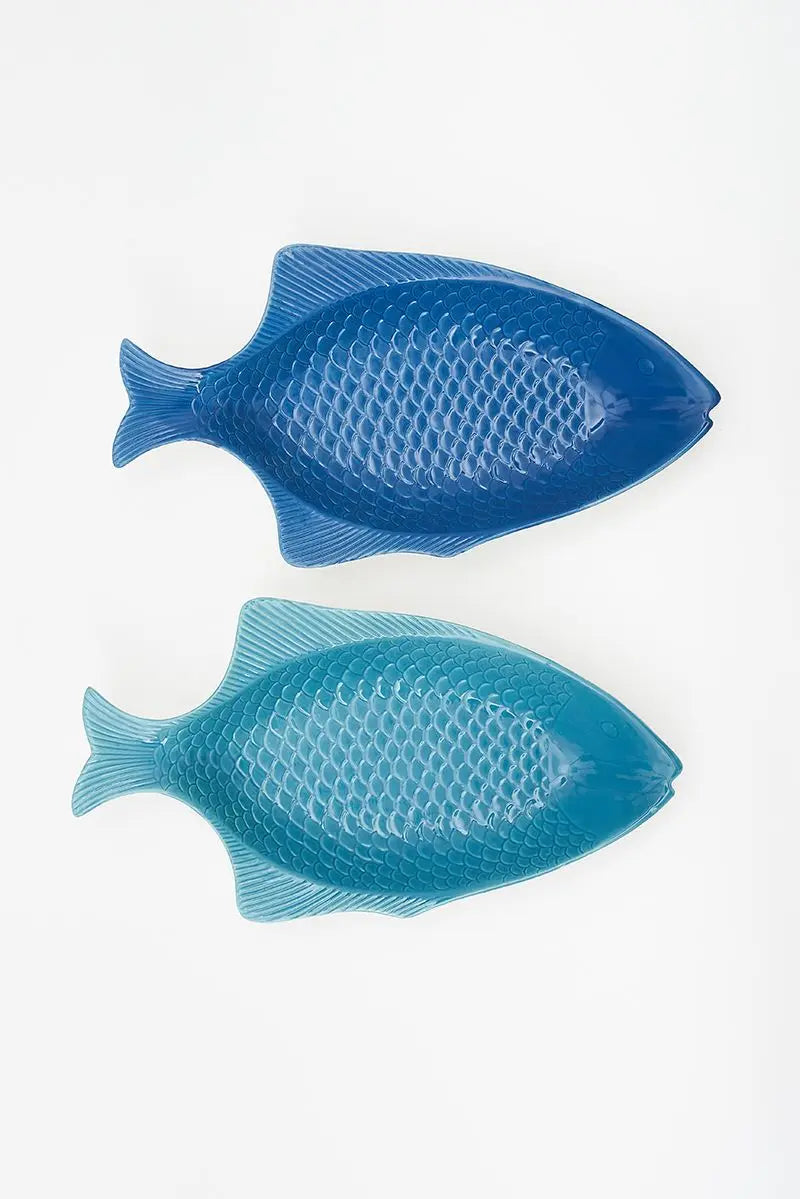 Set de dos bandejas para tu cocina con forma de pez en colores turquesa y azul. Están hechas en cerámica. Dimensiones: l: 37,5 cm – w: 20 cm – h: 5,5 cm.