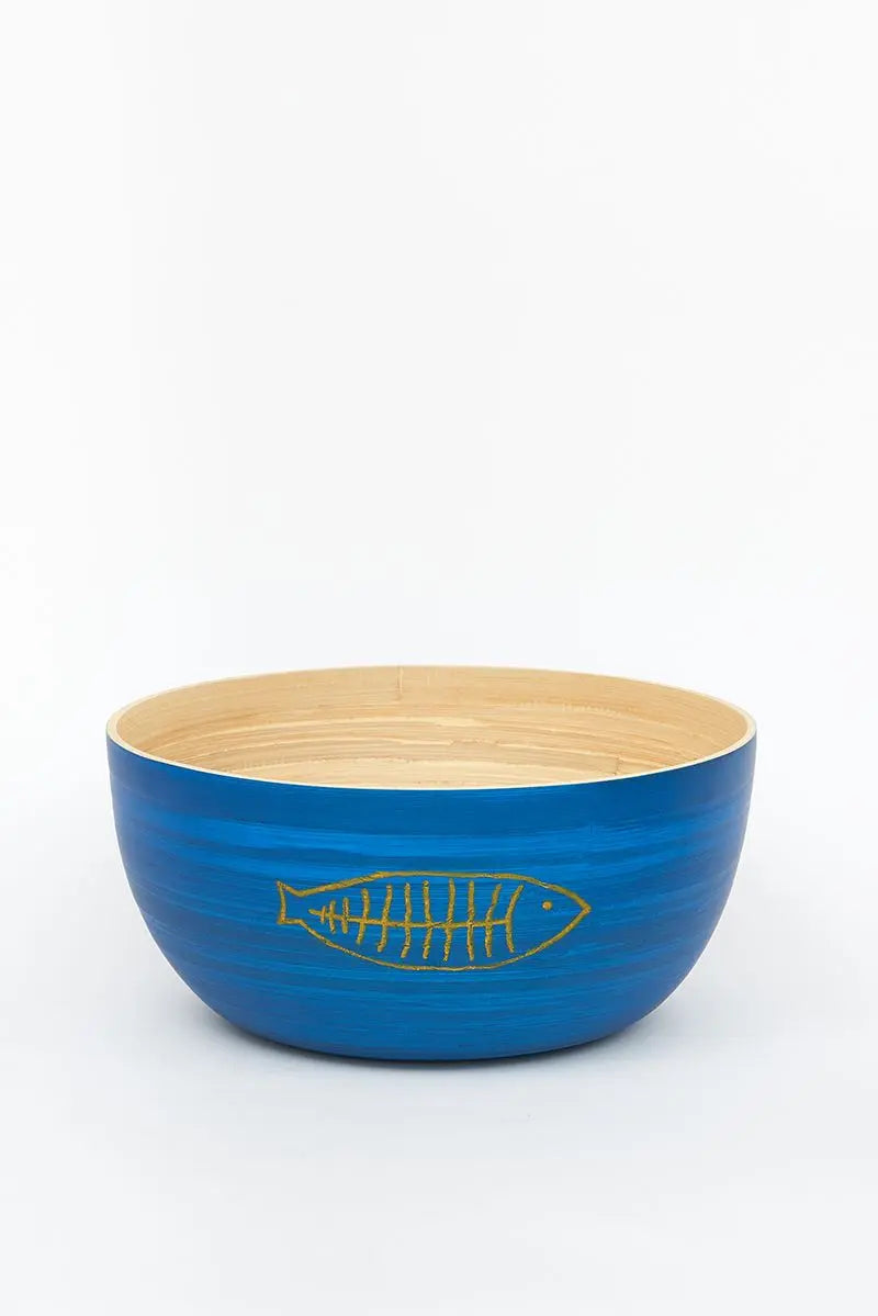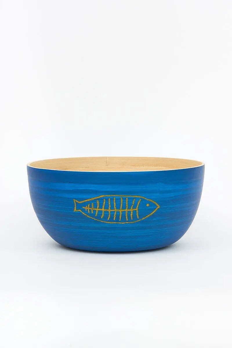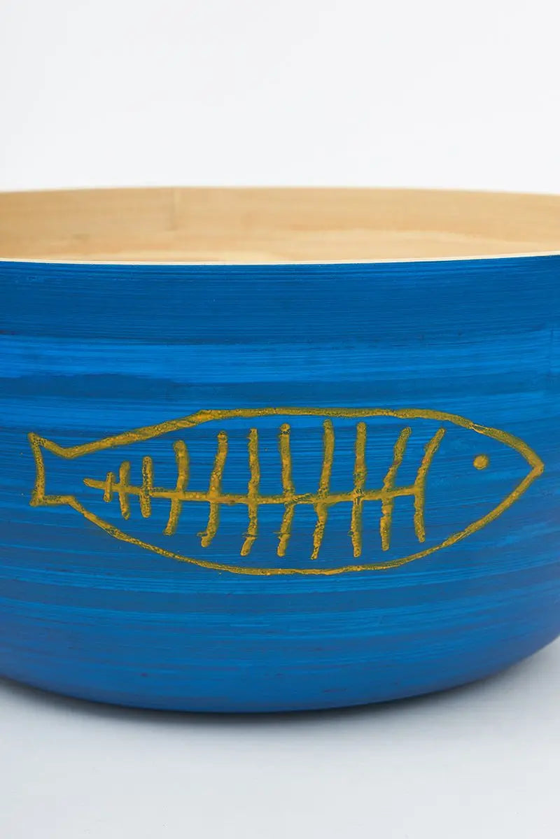 Set de 3 boles de bambú con espinas de peces grabadas en el exterior. El interior es de bambú natural y el exterior va pintado en diferentes tonos azules. Dimensiones: h: 13 cm – ø: 28 cm.