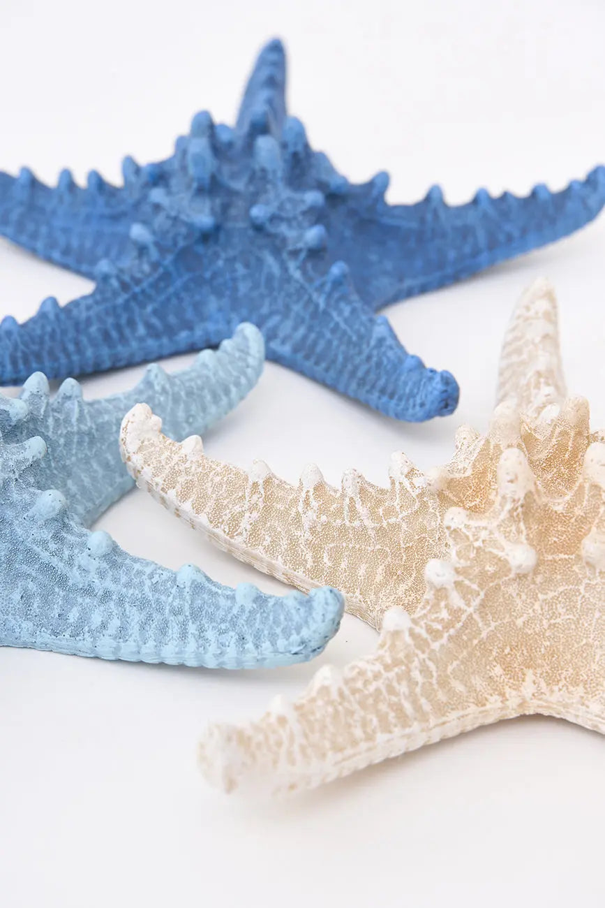 Set de 3 estrellas de mar decorativas en diferentes tonos de colores, fabricadas en resina de alta calidad, perfectas para agregar un toque marinero y alegre a tu decoración. Dimensiones: l: 18 cm – w: 18 cm – h: 5 cm.