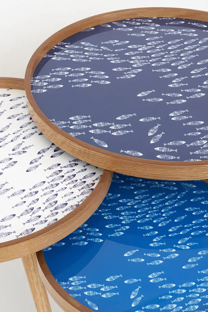 Set de 3 mesas en madera de centro con peces: estilo náutico depurado crea un ambiente náutico depurado en tu espacio con nuestro set de 3 mesas en madera de centro, cada una adornada con pequeños peces pintados. Estas mesas ofrecen funcionalidad y estilo en tres tamaños diferentes, permitiéndote jugar con la disposición y añadiendo un toque marino a tu hogar. ¡eleva la elegancia náutica con este conjunto de mesas único. Dimensiones: h: 55 cm – ø: 60 cm.