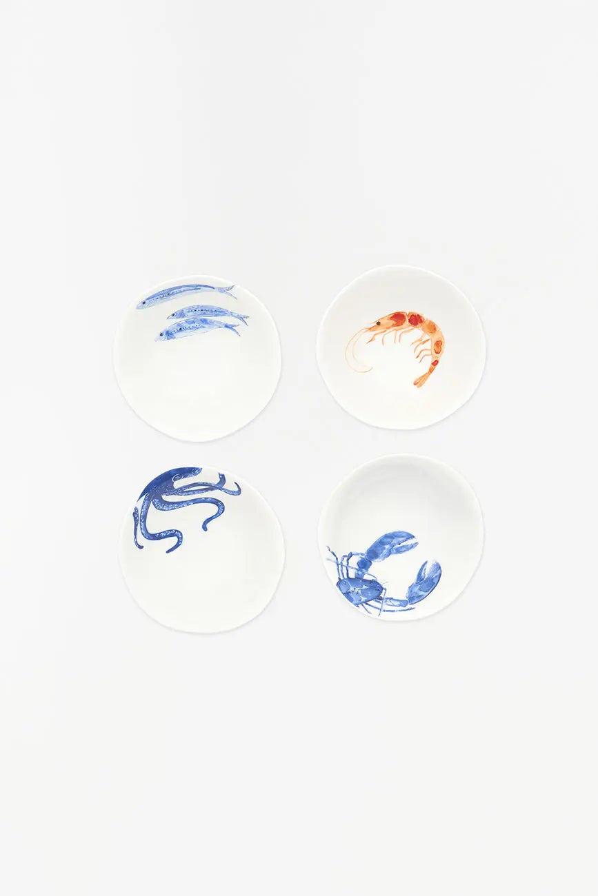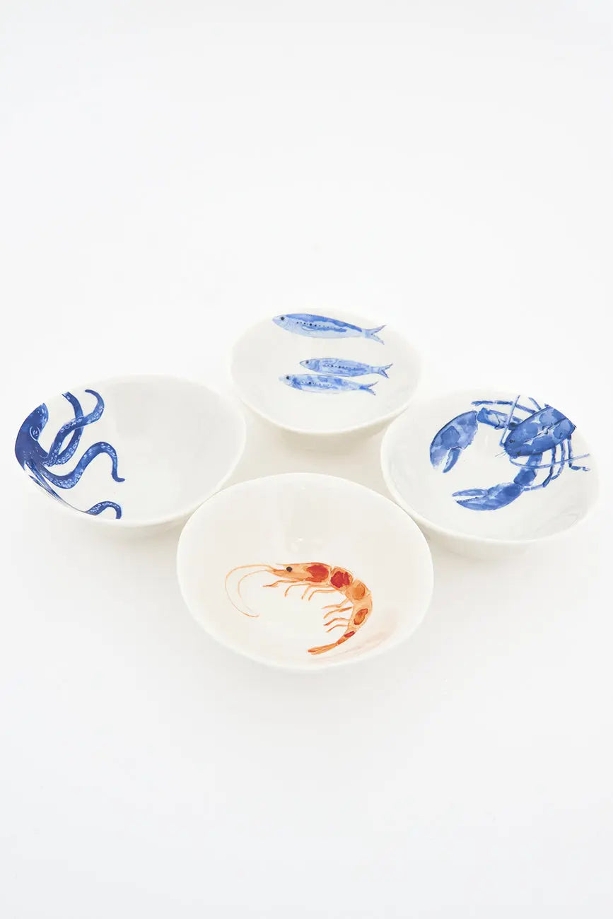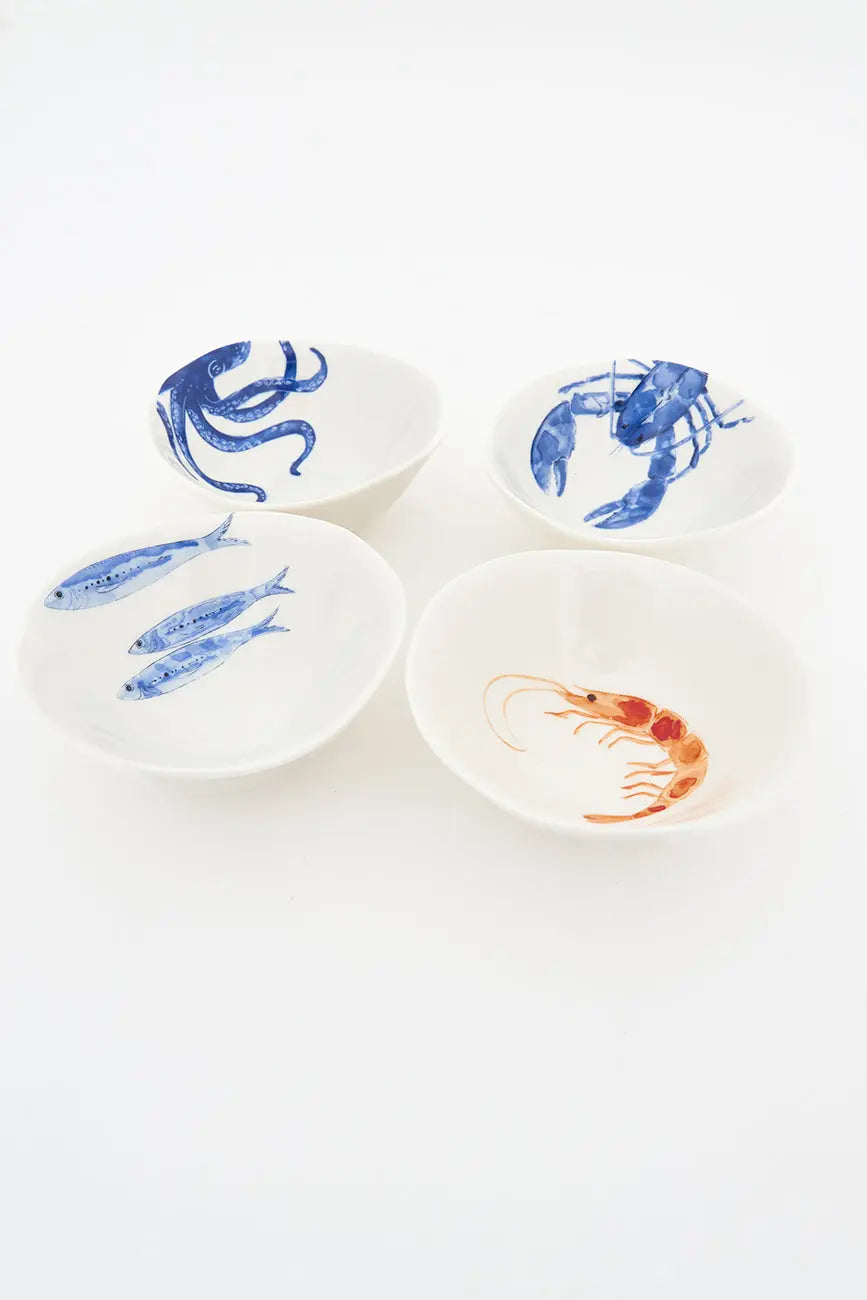 Set de 4 boles de porcelana con diseños de animales marinos: uno con peces, otro con pulpo, otro con langosta y otro con gamba. Cada bol de alta calidad presenta un diseño único y detallado, ideal para añadir un toque marinero a tu mesa. Dimensiones: h: 4,5 cm – ø: 10,5 cm.