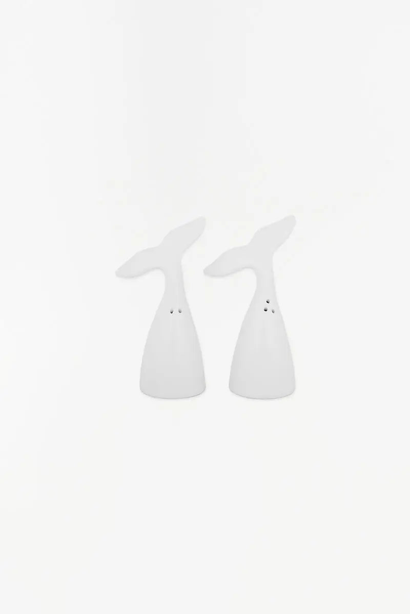 Set de salero y pimentero de cerámica con forma de ballena. Un detalle original para tu mesa. Dimensiones: h: 12 cm.