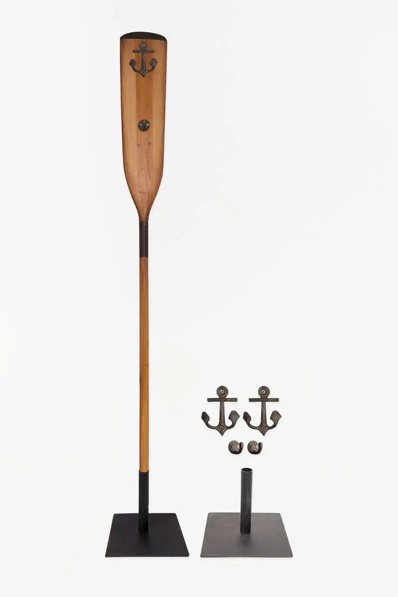 Soporte de metal para colocar el remo en sentido vertical. Incluye cuatro colgadores con los que el remo se convierte en perchero.