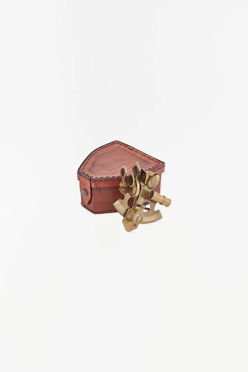 Sextante decorativo en latón y con su estuche de cuero serigrafiado.