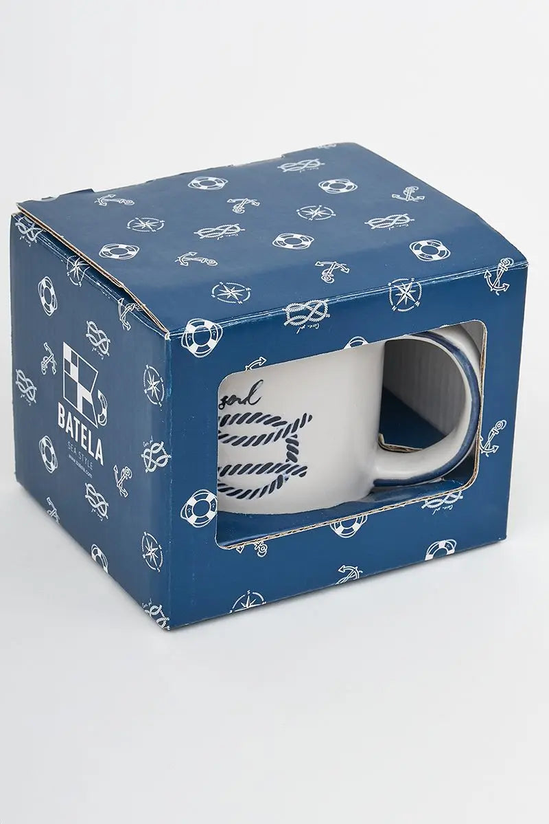 Taza de gres con un nudo marinero en color azul impreso. Viene con una caja de cartón. Dimensiones: h: 9 cm – ø: 9,7 cm.