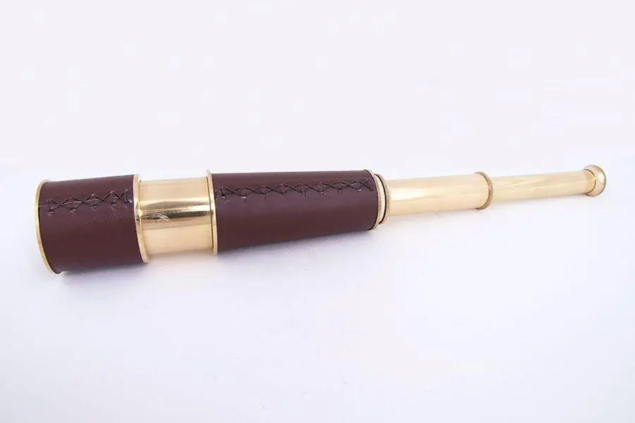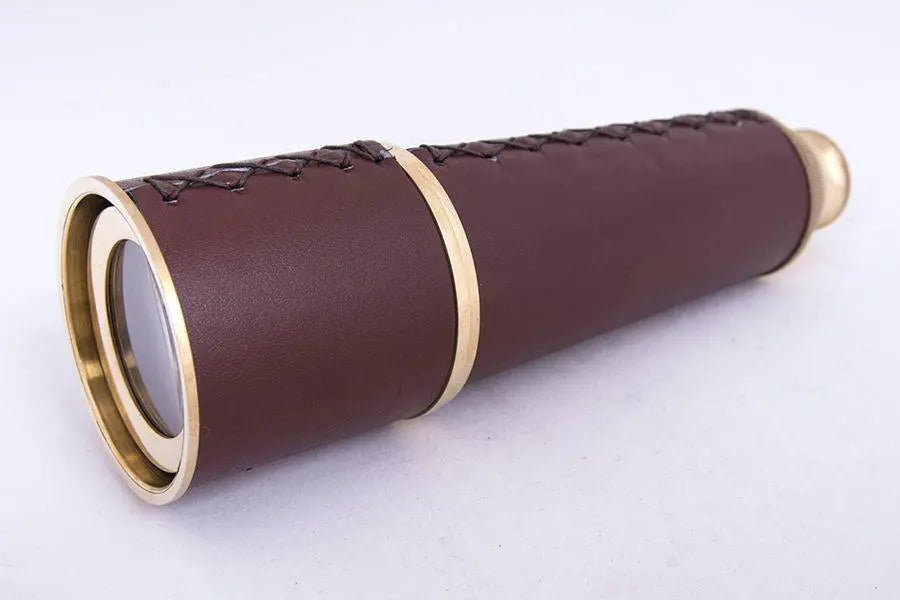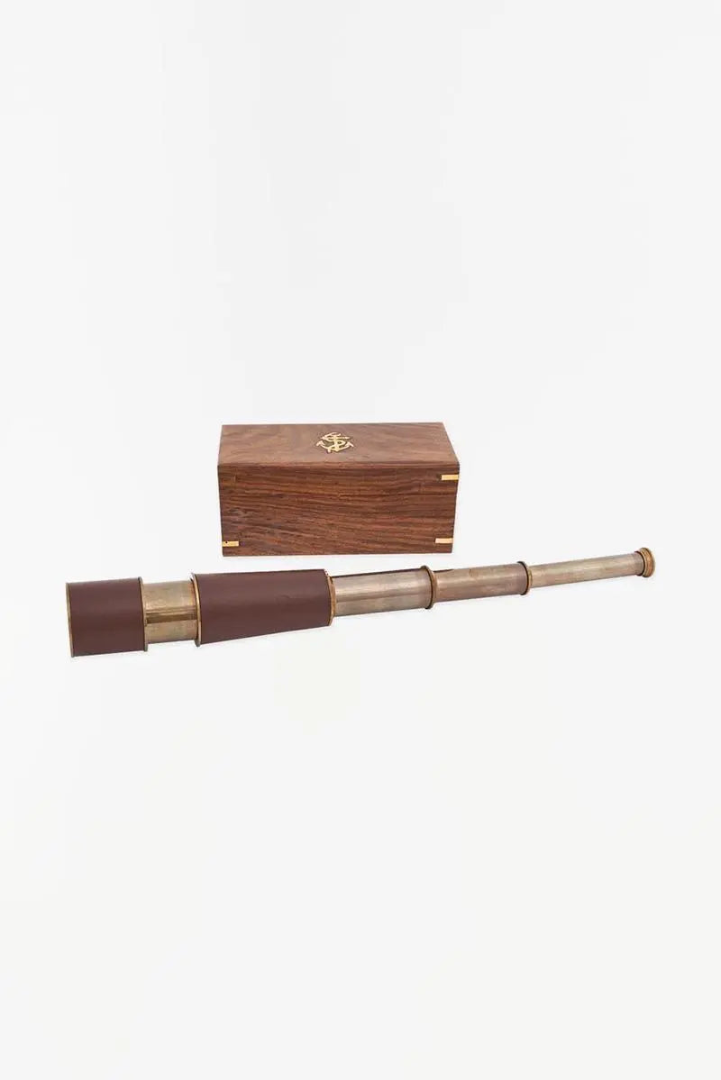 Telescopio de latón y cuero con una terminación envejecida. Viene en una caja de madera. Dimensiones: l: 48 cm – ø: 5,5 cm.