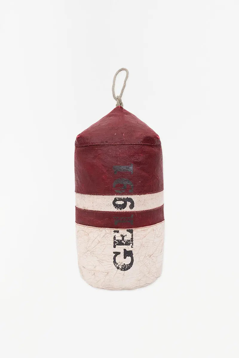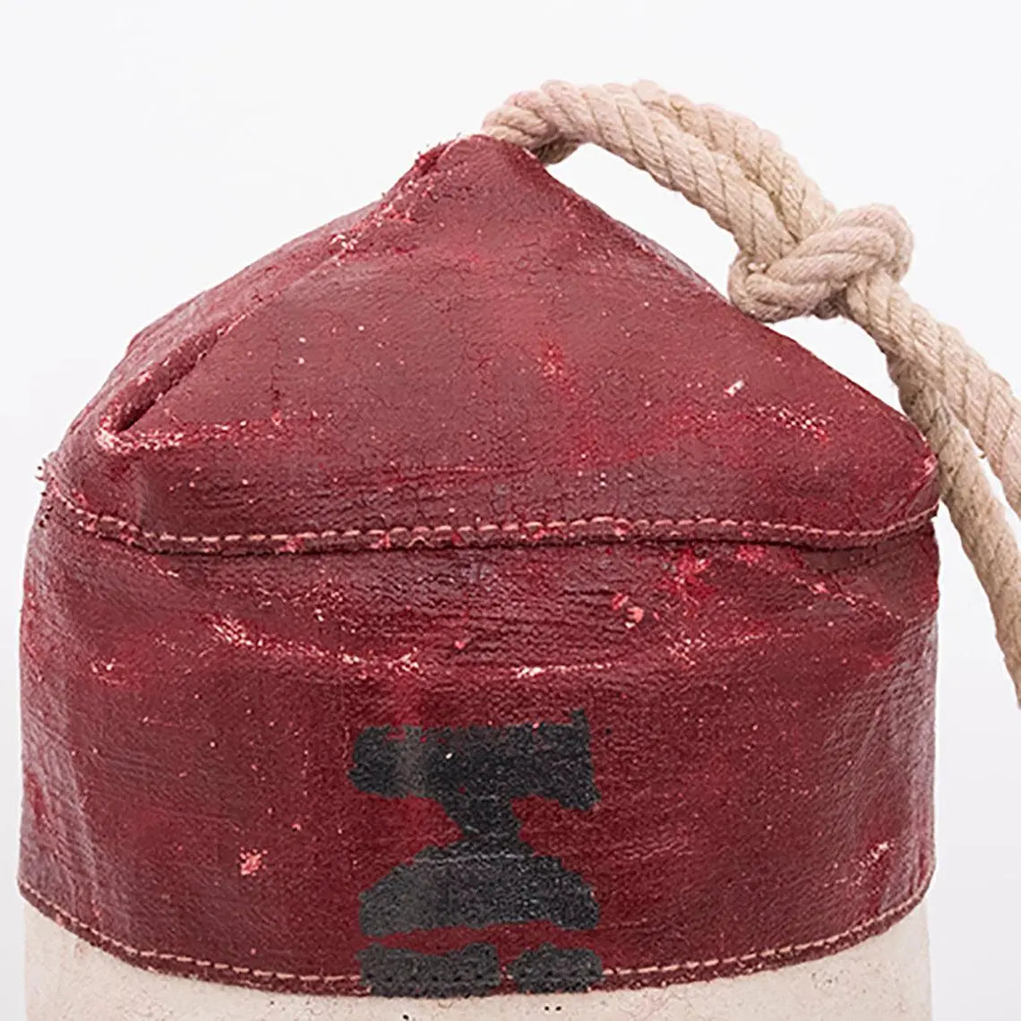 Sujetapuertas con forma de boya. Está pintado con una terminación envejecida que le confiere el aspecto de las verdaderas boyas de puerto. Dimensiones: h: 30 cm – ø: 15 cm.